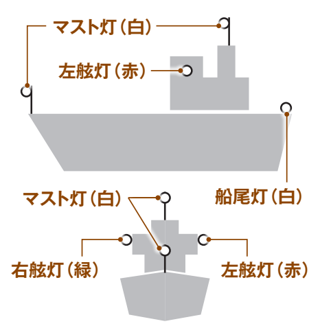 一方、夜間は旗が見えにくいため、灯りによる合図が中心になります。たとえば左舷灯は赤、右舷灯は緑と定められており、相手船がどちらを向いているのかを瞬時に判断できます。