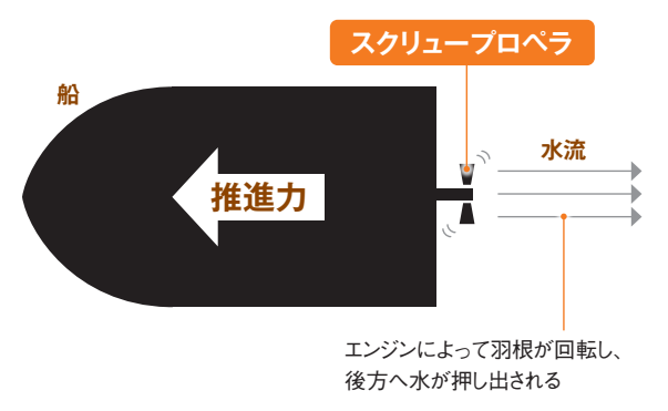 船を前へ進める力の源は、船尾に取りつけられたスクリュープロペラです。ネジ(スクリュー)の原理により回転によって水を後方へ押し出し、その反作用が前向きの力として船に働きます。水の流れを生み、その流れに押されることで船は進んでいくのです。