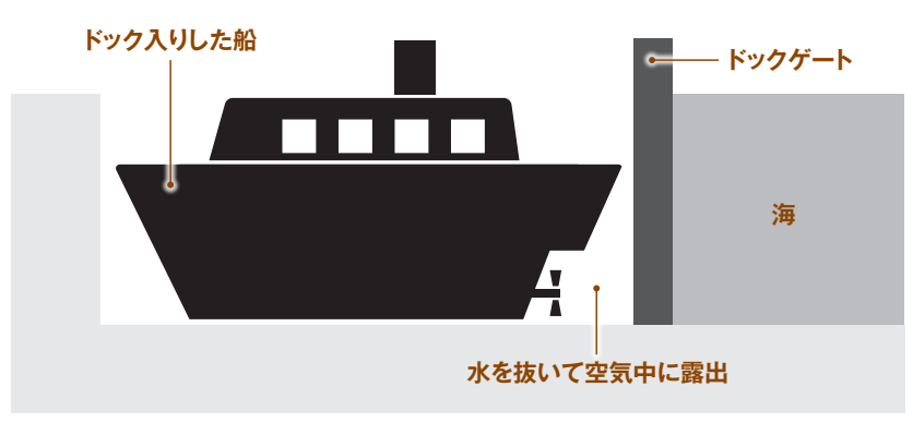 造船所の中心施設であるドックでは、船を海から上げ、船底やプロペラなど普段見えない部分を点検・補修します。性能の低下を防ぎ、船の寿命と安全性を保つ重要な役割を担います。