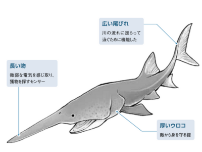 ハシナガチョウザメは、中国・長江に棲んでいた世界最大級の淡水魚です。体長は7mにも達し、刀のように長い吻には微弱な電気を感知する細胞があり、泥水の中でも甲殻類や魚を見つけて暮らすことができました。その起源は2億年以上前にさかのぼり、恐竜の時代をも生き延びた「生きた化石」とも呼ばれていました。