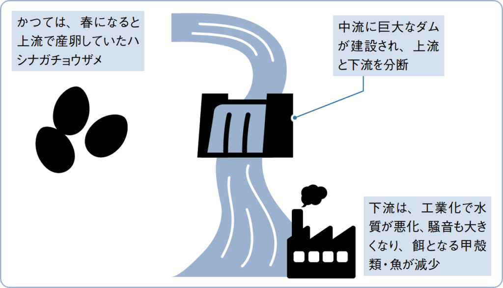 巨大ダムの建設で産卵地の上流に戻れなくなったことや、下流の環境汚染で幼魚が生き残れなくなり、やがて絶滅しました。
