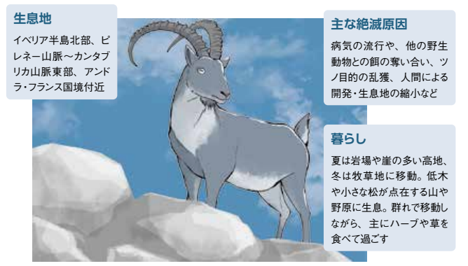ピレネーアイベックスは、ヨーロッパの山岳地帯に生きたヤギの仲間です。季節ごとに高地を移動し、群れで穏やかに暮らしていましたが、乱獲や環境変化などが重なり、2000年に絶滅しました。