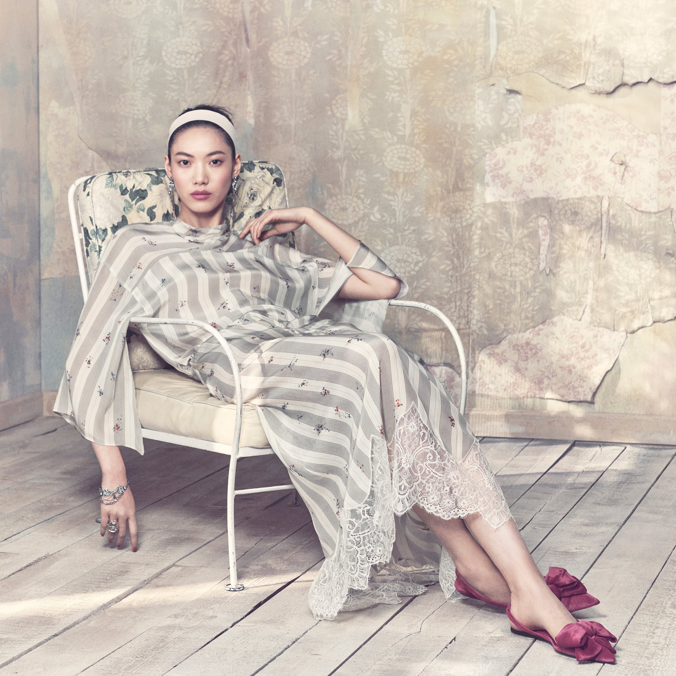 今回ワードローブ全体を通して再構築されるのは、親しみのあるアイテムたち。レースの切り替えから広がるアシンメトリーなスリップドレスや、シアーなキャミソールで柔らかさを添えたストライプのセットアップ。裾をほつれさせたロングツイードコートはフローラルパンツとレイヤードし、透け感のあるニットはキャミソールやスリップの上に重ねられます。アクセサリーにもコレクションの世界観が反映され、ルビー、ティール、マスタードカラーのサテンボウ付きミュール、ギャザーを寄せたロゼットモチーフのクラッチ、クリスタルのドロップイヤリング、ホワイトのヘッドバンドなどが、淡いパレットにアクセントを添えています。
