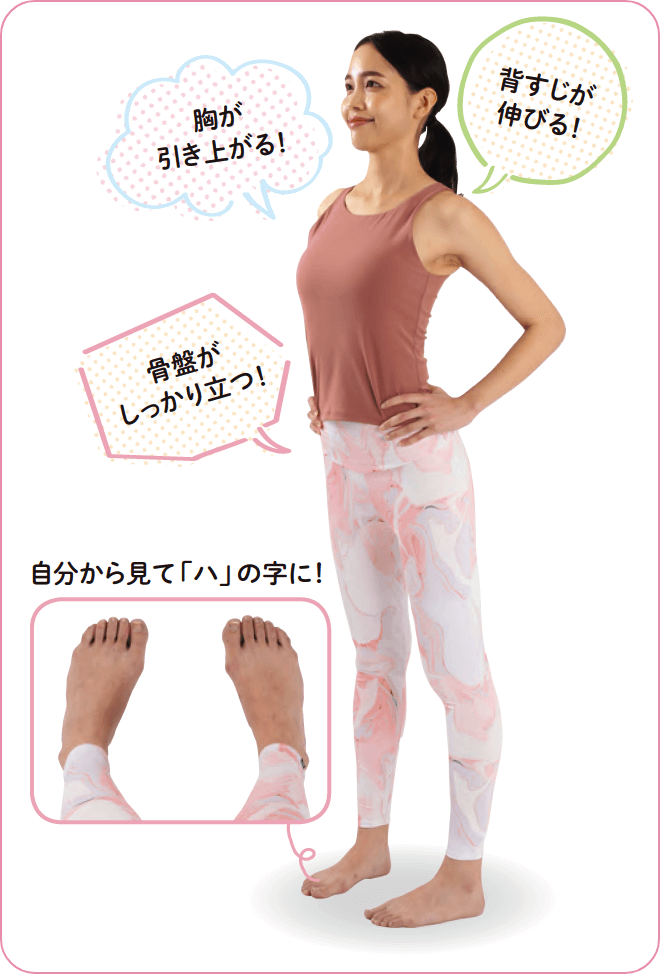 そこで、まずは体のベースとなる脚から整えていきます。足幅を狭くして両足を「ハ」の字に開き、親指側に体重を乗せます。すると自然にひざが伸び、骨盤が立ってお尻が上がり、おなかの筋肉が伸びることで胸も引き上がります。脚→骨盤→胸の順番で姿勢を整えることで、美しい姿勢が完成するのです。
