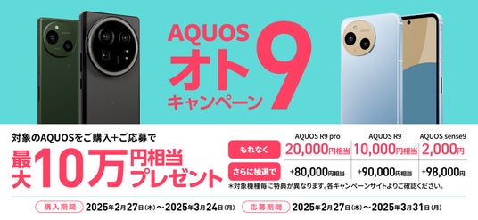 シャープは、対象のスマートフォン「AQUOS」のご購入とご応募により、最大10万円相当をプレゼントする「AQUOS オト9(オトク)キャンペーン」を、本日2月27日(木)より開催します。
