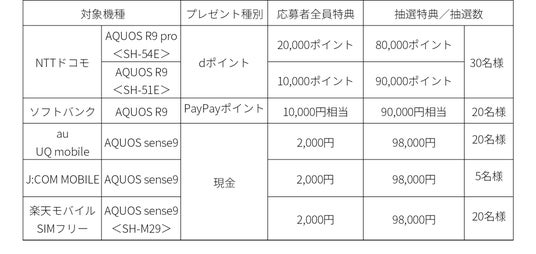 「AQUOS オト9(オトク)キャンペーン」を開催!対象のスマートフォン「AQUOS」のご購入で、最大10万円相当をプレゼント