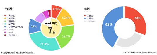 パラレルのユーザー属性(ユーザー層はα~Z世代が7割を占めており、性別は男女ほぼ半々)