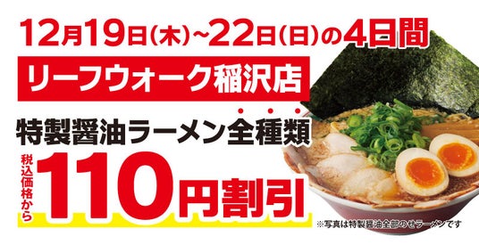 この度オープンを記念して、「リーフウォーク稲沢店」にご来店いただいたお客様には、『特製醤油ラーメン全種類』を税込価格から110円割引で販売いたします。