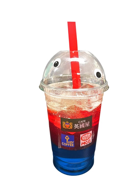 🌍目玉つき!? 見た目も楽しい、万博限定ドリンク CAFE英國屋の「万博ソーダ」- ここでしか飲めない、三層の味と遊び心! 「万博ソーダ」は、CAFE英國屋が大阪・関西万博のために開発した、赤・青・透明の三層で構成された特別ドリンク。