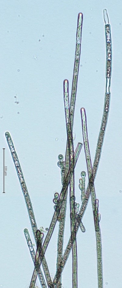 2023年4月14日、初めて北の丸公園(図1)の藻類相を調査した際、園内に人工的に設置された滝(図2)の滝壺に、カワモズク科の胞子体世代が生育しているのを発見しました(図3)。高さ4mmに達する赤茶色の毛筆のような体(図4)で、滝壺の底の岩盤を覆うように着生していました。顕微鏡観察の結果、単列細胞の糸状体からなり(図5)、枝に単胞子嚢を形成しているのが分かりました(図6)。藻の形態からカワモズク科の胞子体であることまでは見当がつきましたが、雌雄の配偶体が見つからないこともあり、種までは分かりませんでした。そこでDNA解析を行ったところ、本藻がチャイロカワモズク属(Sheathia)の未記載種であることが判明しました。