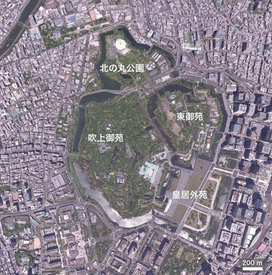 図1 北の丸公園と吹上御苑の位置「地理院地図空中写真加工」