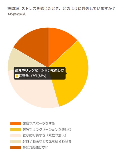 自分の趣味に打ち込んだり、リラックスできる時間を設けたりすることで、ストレスを発散している学生が多いようです。