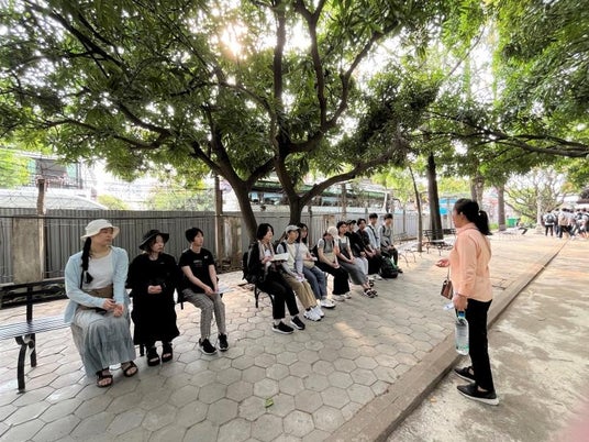 ワットシーサケーオ(ラオス)でガイドから説明を聞く学生たち