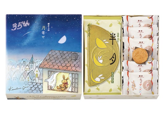 鎌倉の夏の夜空が一面に広がる、幻想的なデザインの『月寄せ』。窓辺で涼む看板うさぎ「きぼり」がみつめる先には、35周年にかたどられた星座がきらりと光ります。きらめく星たちに、流れ星、ぼんやりと浮かぶ“鎌倉半月シルエット”のお月様まで、みんなで鎌倉五郎の35周年をお祝いしてくれているのかも。夏の鎌倉土産としてはもちろん、ご友人のうさファンや大切なご家族へのプレゼントにもぴったりです。