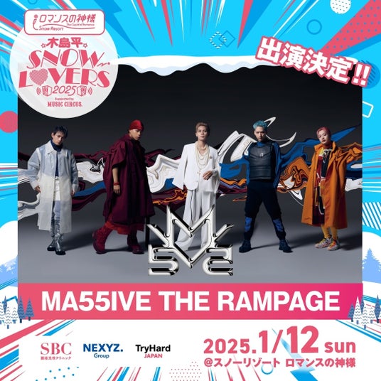 株式会社TryHard Japan(大阪市中央区)は、SBCリゾート木島平と株式会社MUSIC CIRCUS(東京都渋谷区)が2025年1月12日(日)スノーリゾート ロマンスの神様にて開催する、音楽イベント「木島平SNOW LOVERS 2025 Supported by MUSIC CIRCUS」の追加出演アーティストを発表いたします。