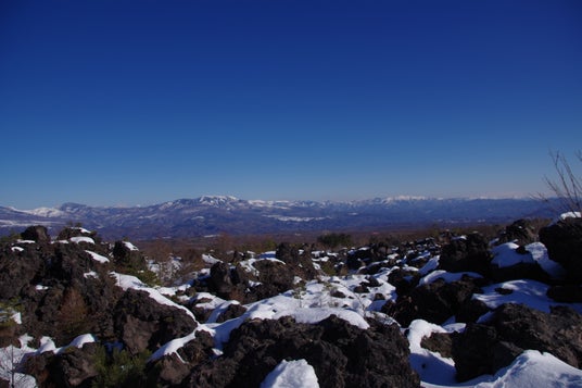 青空の下 黒と白のコントラストが映える鬼押出し園