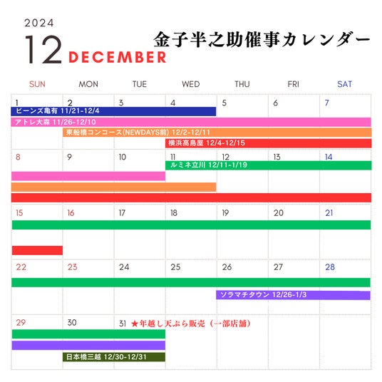 オイシーズ、日本橋 天丼 天むす 金子半之助(2024年12月度)催事出店情報のお知らせ【季節限定商品、大晦日天ぷら販売あり・】
