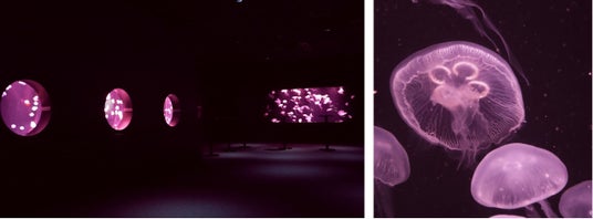 【(左) “愛のクラゲイルミ”(右)ピンク色に染まるミズクラゲ】