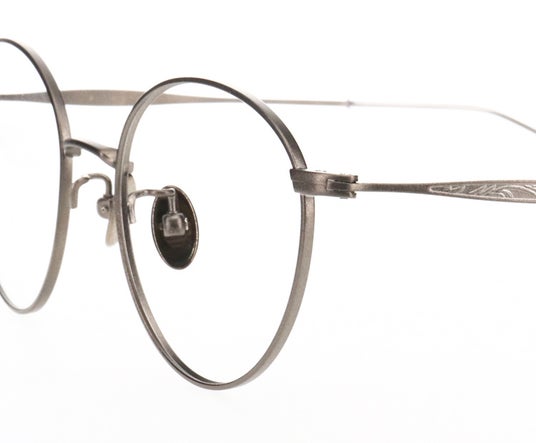 チタンに微細なガラスの粒子を吹き付け、表面に細かな凹凸をつけるサンドブラスト加工を施すことで光沢を抑えマットな質感に。素材や上質感にこだわる、大人向け眼鏡。