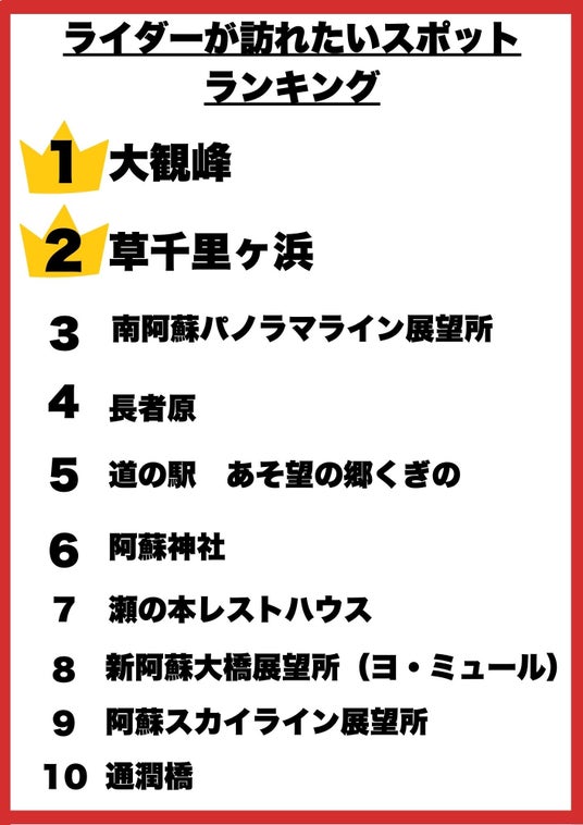 バイクで回りたい阿蘇山周辺スポット10選【「阿蘇を巡るバイク旅!「あなたのおすすめスポット」アンケート」結果報告】
