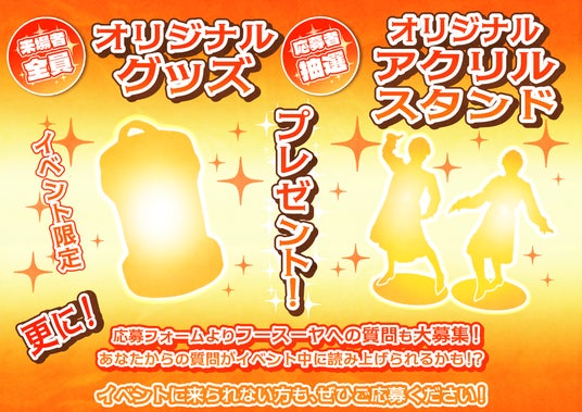 本公演は「ファンでん」の会員様(新規登録も可)を対象に、フースーヤによる漫才はもちろん、お客さま参加型コーナーや質問コーナー、また来場者さま全員に限定グッズをプレゼントするなど、盛り沢山な内容となっております。