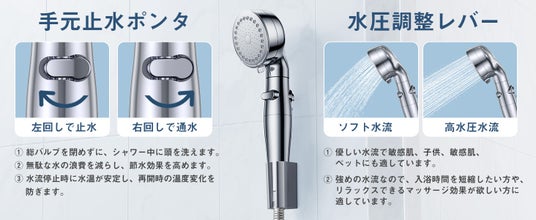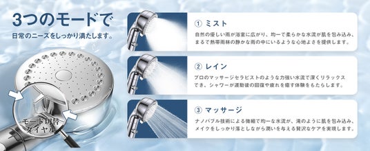 3つの出水モード(レイン、マッサージ、ミスト)を搭載し、ボタンひとつで簡単に切り替え可能。手元で止水できるボタン付きで、節水率は最大80%!