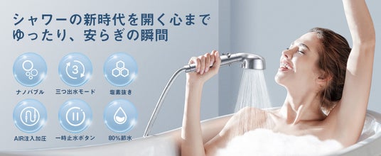 3億8,000万個の超微細バブルが毛穴に浸透し、通常のシャワーでは落としきれない汚れや油脂をしっかり除去。さらに、ナノバブルが肌を優しく整え、潤いを保ちます。シャワー後の肌は、まるでシルクのような滑らかさ!