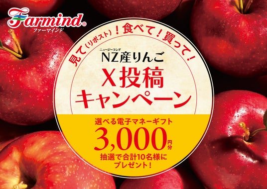 今が旬!ファーマインドのニュージーランド産りんごを「見て」「食べて」「買って」Xに投稿。抽選で電子マネーギフト3,000円分が当たる!【NZ産りんごX投稿キャンペーン】を開催!
