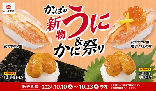 コロワイドグループのかっぱ寿司(カッパ・クリエイト(株) 本社:神奈川県横浜市、代表取締役社長:山角豪)は、2024年10月10日(木)~10月23日(水)の期間、『かっぱの新物うに&かに祭り』をかっぱ寿司全店にて開催いたします。