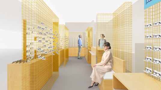 今回店舗リニューアルを担当するのは建築家の永山祐子氏です。15坪という限られたスペースを最大限活用するため、横長の区画の間口を活かし、商品を前面に、視力測定機や加工機を後方に配置した店内レイアウトに一新しました。
