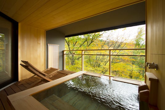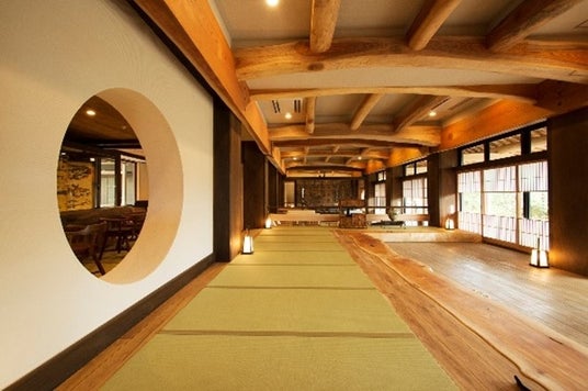 箱根強羅温泉にある箱根連山の絶景が人気の旅館「円かの杜」は、花扇グループ最上級グレードの宿として、全館畳敷き、泉質の異なる2本の源泉によって全20室の露天風呂付き客室と大浴場の館内湯めぐりを愉しめる。    公式サイト:https://gorahanaougi.com/madokanomori/