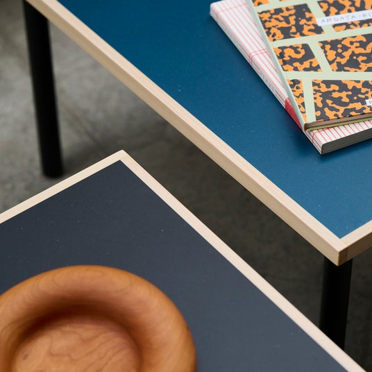スチールパイプの組立式脚とカラフルなMDF、ヒノキを組み合わせた天板。シンプルながらも強度と軽量性を実現しています。軽量かつ強固なスチールパイプ脚と、床面を保護するワイドベースを備えています。組み立て簡単でフラットパック設計のため、常設利用だけでなくポップアップショップなどの仮設利用にも最適です。天板と脚の色を選べるカラーバリエーションがあります。