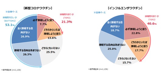 新型コロナワクチン接種意向があった人は全体で21%。接種意向なしは53%。インフルエンザワクチン接種意向(41%)の方が約20ポイント高い。