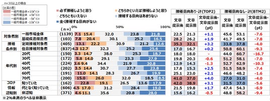 新型コロナウイルス感染症とコロナワクチン接種についての正確な情報を読んでもらった後では、「接種意向なし」が概ね減少し、「接種意向あり」が微増、「どちらともいえない」が増加した。70代では、「接種意向あり」が37%から41%に増加。「コロナ情報を(以前から)知っていた」と答えた人で接種意向が39%から42%に増加、「定期接種対象者」でも32%から35%に増加した。