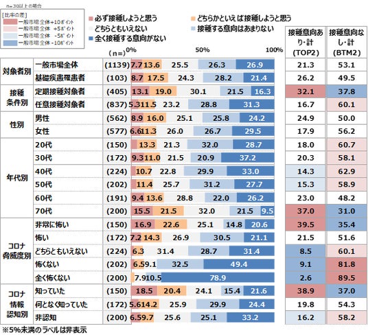 接種意向ありの人は、基礎疾患罹患者(26%)、定期接種対象者(32%)、70代(37%)で高い。性別でみると、女性より男性の方が7pt高い。新型コロナウイルス感染症を「非常に怖い」と思っている人、新型コロナウイルス感染症の情報を「知っていた」人は新型コロナワクチン接種意向が39%と高い。