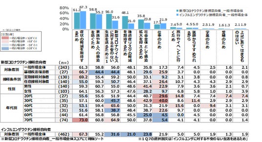 接種意向がある理由では、「不安のない生活を送るため」(新型コロナ56%、インフルエンザ32%)「後遺症リスクの軽減を期待するため」(新型コロナ48%、インフルエンザ21%)「社会全体として感染拡大を抑えるため」(新型コロナ36%、インフルエンザ24%)で、新型コロナウイルス感染症がインフルエンザより高い結果となった。全体では新型コロナウイルス感染症とインフルエンザ両方で、「症状の軽減」「家族や友人への感染防止」「不安のない生活を送るため」が上位に挙がった。