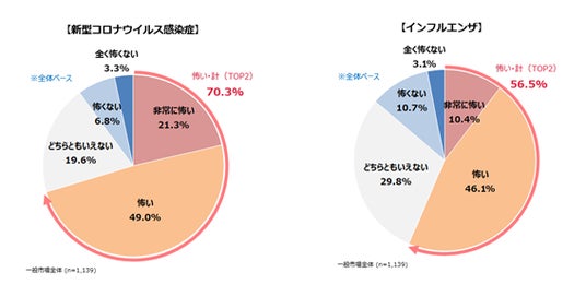 新型コロナウイルス感染症を怖いと感じる人は全体で70%。インフルエンザ(57%)と比較すると、新型コロナウイルス感染症の方が脅威度が高かった。