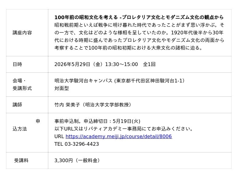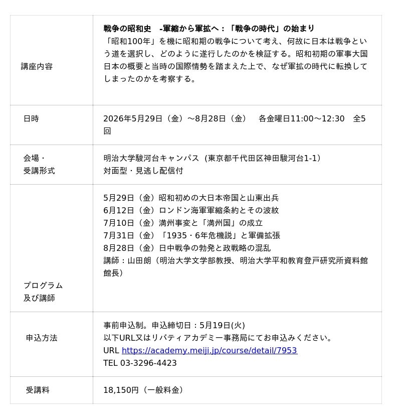 明治大学の生涯学習機関「明治大学リバティアカデミー」は、2026年5月より昭和100年企画と題した講座を開講します。令和8年(2026年)は昭和元年であった1926年から満100年を迎えます。2026年度春期は3つの講座「戦争の昭和史」「100年前の昭和文化を考える」「元号の歴史と日本人」を開講します。いずれの講座も明治大学の教員が講師を務める対面講座です。講座ごとに事前申込が必要です(有料)。