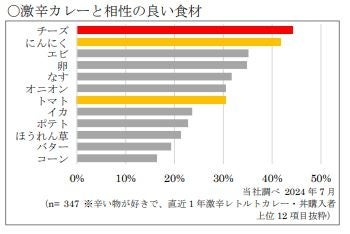 ・激辛カレーに合う食材に着目 激辛カレーと相性の良い食材として、「チーズ」や「にんにく」は上位に挙がり、「トマト」も一定の支持があります。