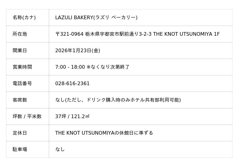 LAZULI PLACEおよびLAZULI BAKERYでは、オープンを記念し、栃木県の食材を主役にした限定メニューをご用意します。 焼き林檎アンバーエール 1,200円(税込) 焼き林檎アンバーエール 1,200円(税込) / LAZULI PLACE栃木県鹿沼市・渡辺りんご園の規格外りんごを使用し、自社のブルワリーで醸造したクラフトビール。フルーティーさとスパイス感が際立つ、冬に寄り添うアンバーエールです。(2月末まで販売予定 / なくなり次第終了) とちおとめデニッシュ 380円(税込) とちおとめデニッシュ 380円(税込) / LAZULI BAKERY栃木県鹿沼市・TOMO and BERRYのとちおとめを贅沢に使用したデニッシュを1日20個限定で販売。(4月末まで販売予定/なくなり次第終了) HAPPY BAG 2,000円(税込) HAPPY BAG 2,000円(税込) / LAZULI BAKERYオープンから1月31日(土)までの期間限定で、焼き菓子やパンなどの詰め合わせバッグを特別価格でご提供。毎日先着20名様限定(おひとり様につき1袋限定)で販売します。 りんごジャムといちごジャム 小:600円(税込)、大:980円(税込) りんご・いちごジャム 小:600円(税込)、大:980円(税込) / LAZULI BAKERY栃木県鹿沼市・渡辺りんご園の林檎とTOMO and BERRYのとちおとめの規格外品を使用。同じく栃木県鹿沼市にある自社ラボで手作りしたジャムを数量限定で販売します。 いずれも、素材の魅力を最大限に引き出した、この場所ならではの一品です。 LAZULI PLACELAZULI BAKERYLAZULI BANQUETは、「旅と人と街の結び目(THE KNOT)」というホテルの思想のもと、日常と非日常が交わる場として、宇都宮の街とともに在り続けることを目指します。 2026年1月23日、街にひらかれた新たな拠点として、 その第一歩を刻みます。 朝の通勤前のコーヒーとパン、休日の優雅なランチ、そして仕事終わりのクラフトビール。宇都宮の日常をアップデートしてくれる「街の特等席」になりそうです。