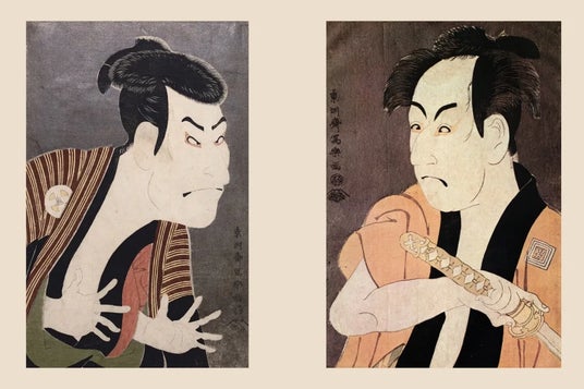 謎の浮世絵師「写楽」による、大胆にデフォルメされて描かれた歌舞伎役者の大首絵。大きな顔、力のこもった小さな手、計算されたアンバランスさがこの浮世絵の鮮烈な魅力となっています。