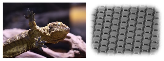 ガラスに張り付くヤモリ(左)の手足の構造を参考にすることで、接着剤を使用しないテープを開発(右:ShineGrip(TM)の拡大写真/信越化学工業株式会社)
