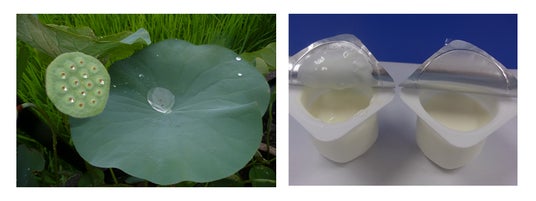 水を弾くハスの葉(左)の構造を参考に、撥水加工を施したヨーグルトのフタが誕生(右:トーヤルロータス(R)/東洋アルミニウム株式会社)