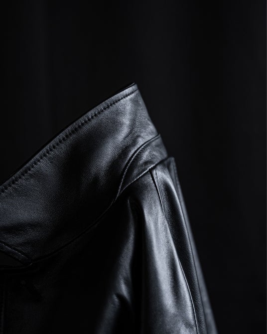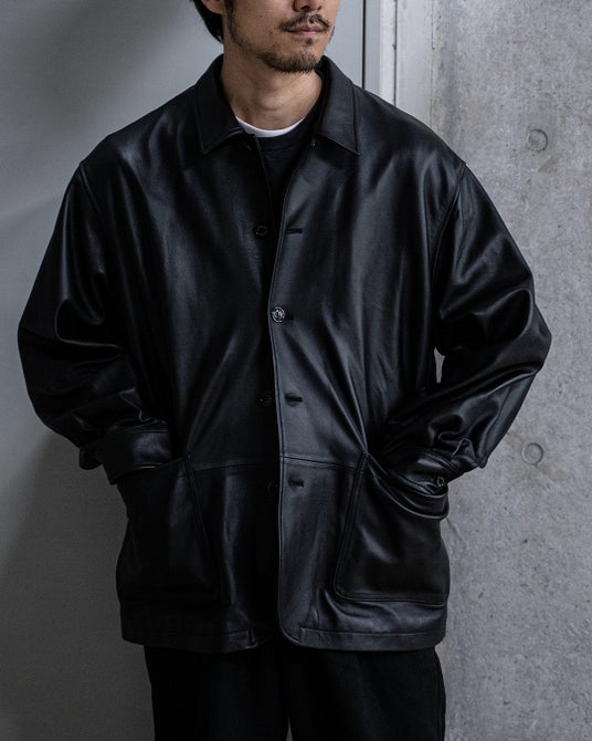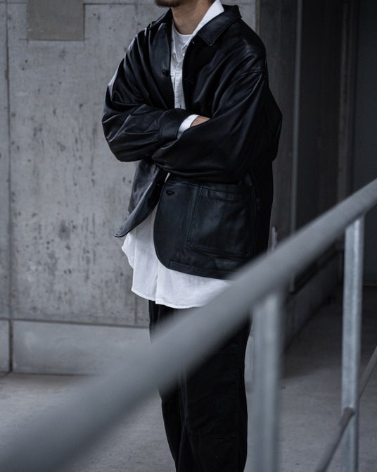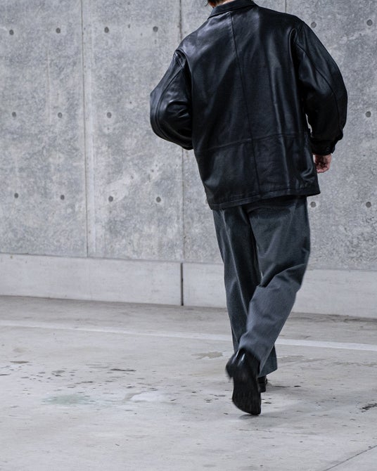 本来、手袋(グローブ)に用いられることが多い0.7mm厚のラムレザー。体を大きく覆う、ゆったりとしたシルエットのジャケットに落とし込むことで、その薄さが活かされ、肌理の細かい革質が、波打つレザーの流れとともに上品に現れます。