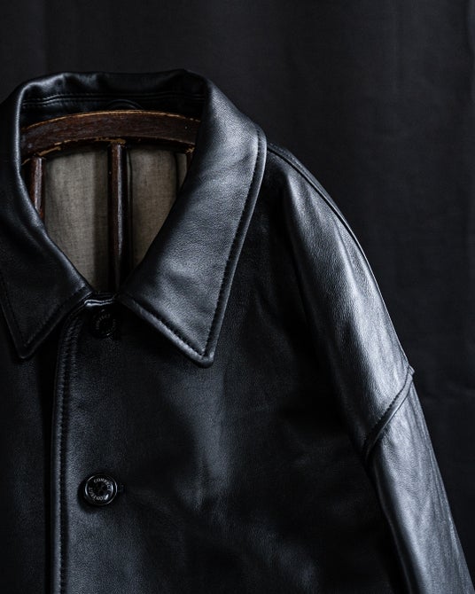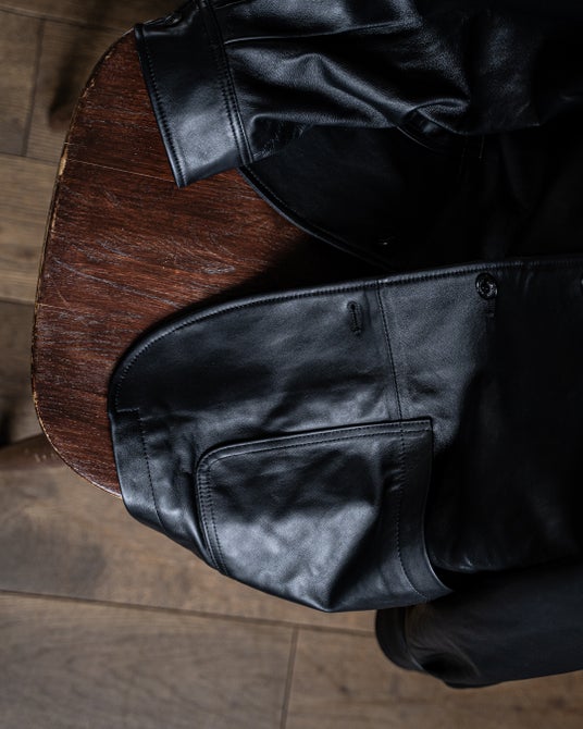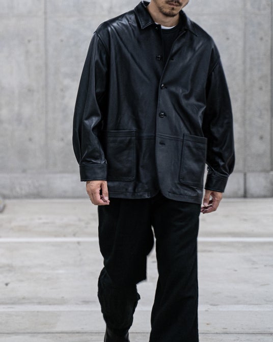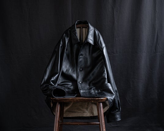 昨年に続き今季も、素材には柔らかく薄い0.7mm厚のラムレザーを用いたことで、たっぷりとしたシルエットと程良いドレープ、着用時には適度なシワ畝のあるレザージャケットをご用意しました。