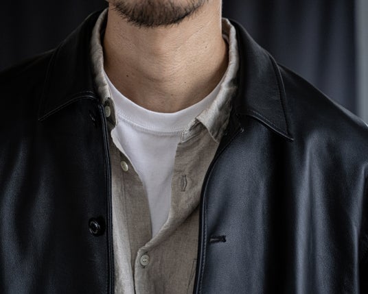 リネンの服をご提案する中で、レザーの上着は、その無骨さや硬さが先立ってしまい、柔らかいリネンとは馴染み難いものという課題がありました。リネンの服をご提案するCONFECTとして、ゆったりと纏うリネンの服と近しい気分で着ることができるレザージャケットは、長年探求してきたものです。