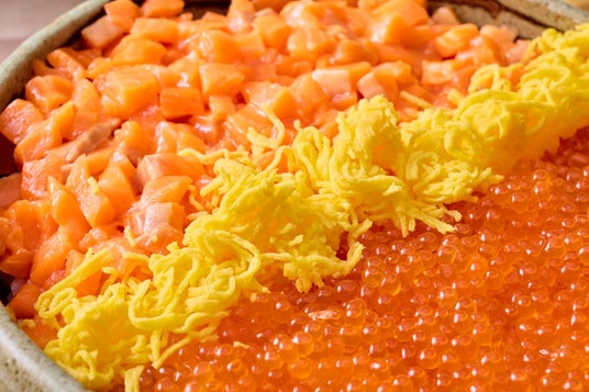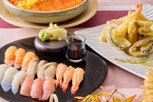 揚げたて天麩羅(ランチ:海老、季節野菜2種/ディナー:海老、キス、季節野菜2種)/寿司(土日祝日ランチ限定:いくらとサーモンの海鮮親子丼/ディナータイム:にぎり寿司 鮪、烏賊、海老、炙りしめ鯖、サーモン)/地元産白米”あいちのかおり”
