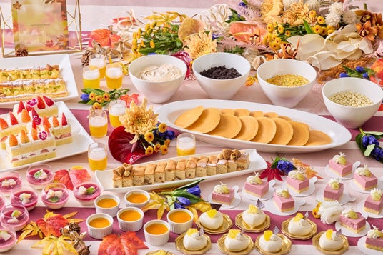 スイーツは、季節のフルーツを使用したムースやケーキなど、パティシエ特製の8種類をご用意。アイスやホイップクリームなどをトッピングして楽しめる”カスタマイズパンケーキ”、6種のアイスクリームと8種のトッピングを混ぜて楽しめる”カラフルストーンアイス”も必見です。料理からスイーツまで、美味しくて楽しい秋限定のブッフェを存分にお楽しみください。