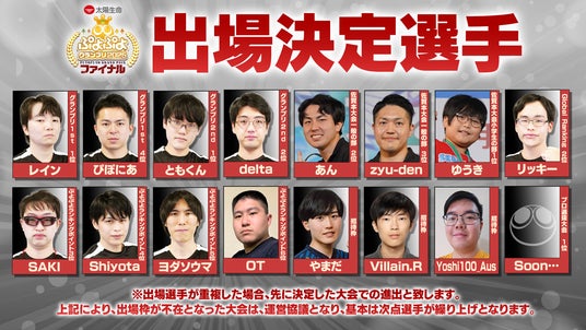 株式会社セガは、ジャパン・eスポーツ・プロライセンス認定タイトルである、対戦アクションパズルゲーム「ぷよぷよ」シリーズについて、2025年3月9日(日)に開催されるセガ公式大会「ぷよぷよランキングプロ選抜大会 2025 決勝」及びセガ公式大会「太陽生命 ぷよぷよグランプリ 2025 ファイナル」の出場選手が決定したことをお知らせいたします。