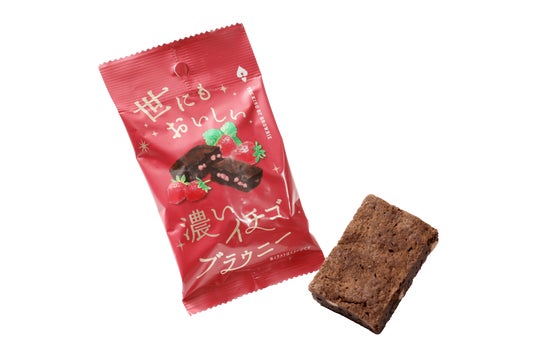 『世にもおいしい濃いイチゴブラウニー』は、濃厚なオリジナルチョコを使用したチョコブラウニー生地に、イチゴの甘酸っぱさを組み合わせ、“濃い”イチゴの風味が広がる味わいに。